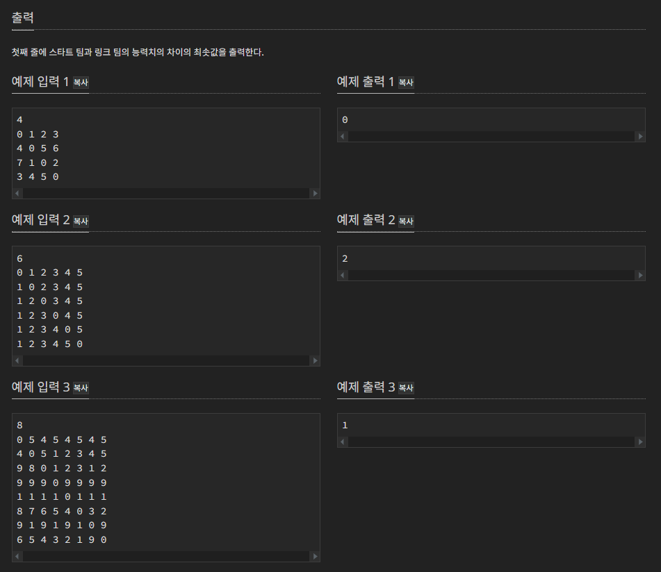 중간에 정확한 시너지의 합을 구하기 위해서 check배열을 통해 스타트팀과 링크팀의 시너지의 합을 정확하게 구하는 부분도 중요 한듯 했다.