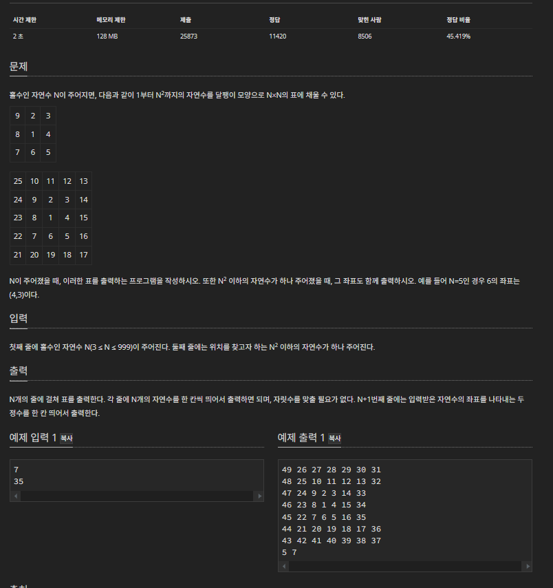 n은 홀수 이기때문에 시작행은 n / 2, 시작 열 : n / 2에서 부터 1을 넣고 방향을 변경해가며 그대로 배열에 값을 채워 넣으면 되는 문제이다.