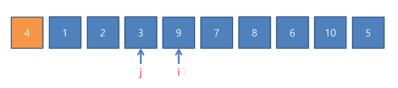 그러면 위와 같이 j와 i가 엇갈리게 됩니다. 엇갈리게 될경우 i, j를 스왑하는게 아니라 pivot과 j를 swap해줍니다.