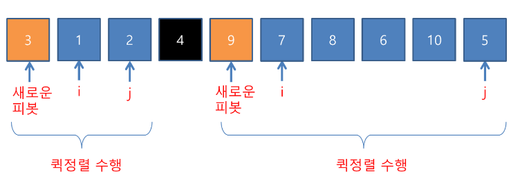 이후 Pivot을 제외한 왼쪽 부분과 오른쪽 부분을 다시 분할 정복으로 같은 로직을 수행해주면 됩니다!