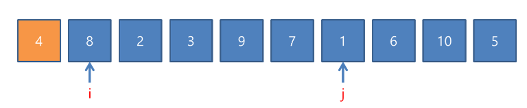 위의 수들을 기준으로 퀵정렬을 수행할 경우 4를 Pivot으로 Left를 8, Right를 5로 잡습니다. (Left = i, Right = j)