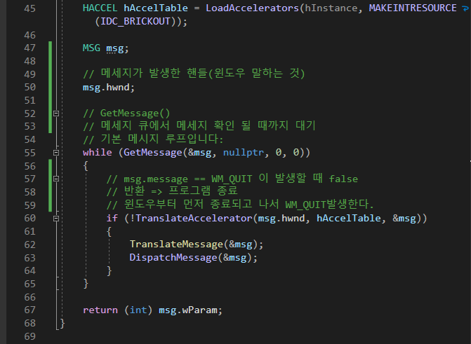 해당 while문은 WM_QUIT이라는 메세지가 발생하면 윈도우창을 닫고 프로그램을 종료를 합니다.