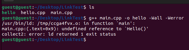 그리고 오브젝트 파일을 가지고 "실행 파일"을 만들려고하는 과정 Hello라는 "function call"을 찾을 수 없기 때문에 발생한 문제입니다.