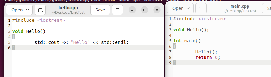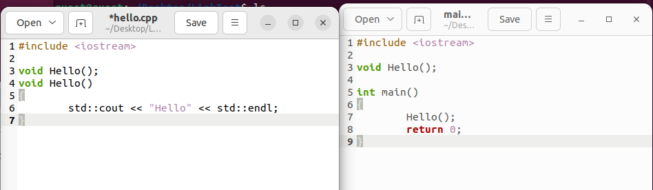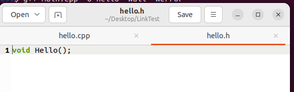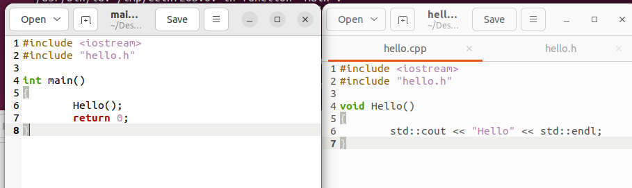 우분투 환경에서 main.cpp, hello.cpp만들고 아래와 같이 코드를 작성해주도록 하겠습니다.
