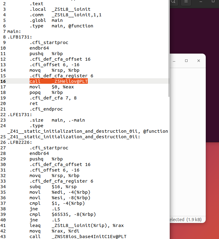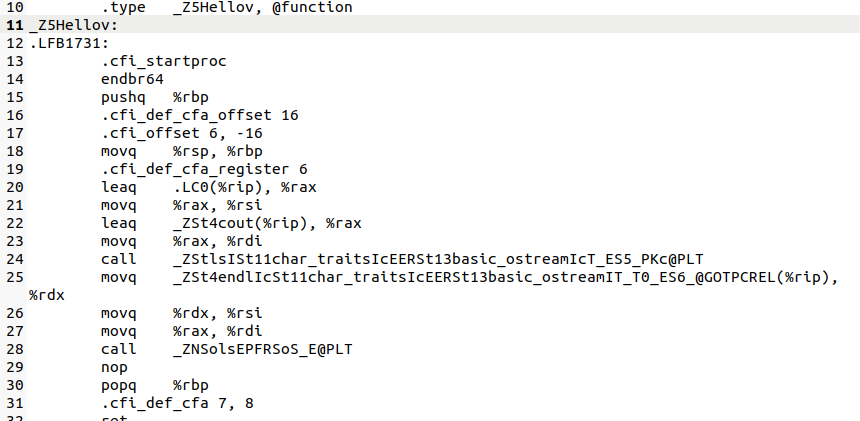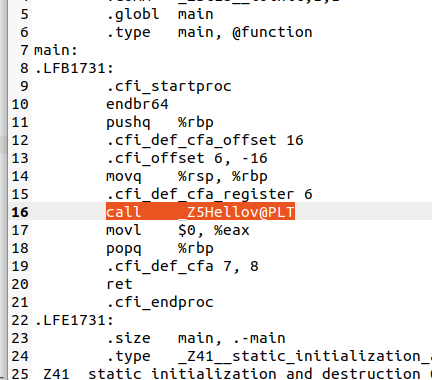근데 Hello라는 함수를 호출을 안하고 _Z5Hellov@PLT?라는 이상한 함수를 호출하네요..