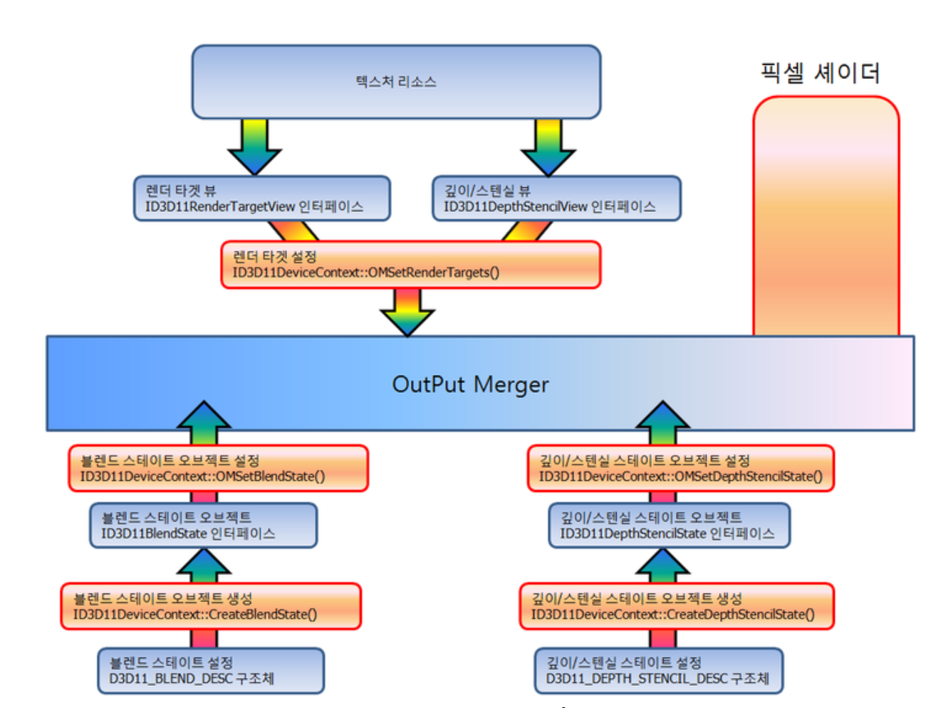 위의 렌더링 파이프 라인을 진행하면서 변경된 부분이나 설정값들을 Render Target View에 그리기 전에 최종적으로 병합 하는 과정정도로 보시면 되겠습니다.