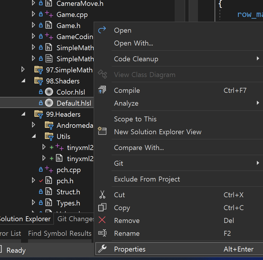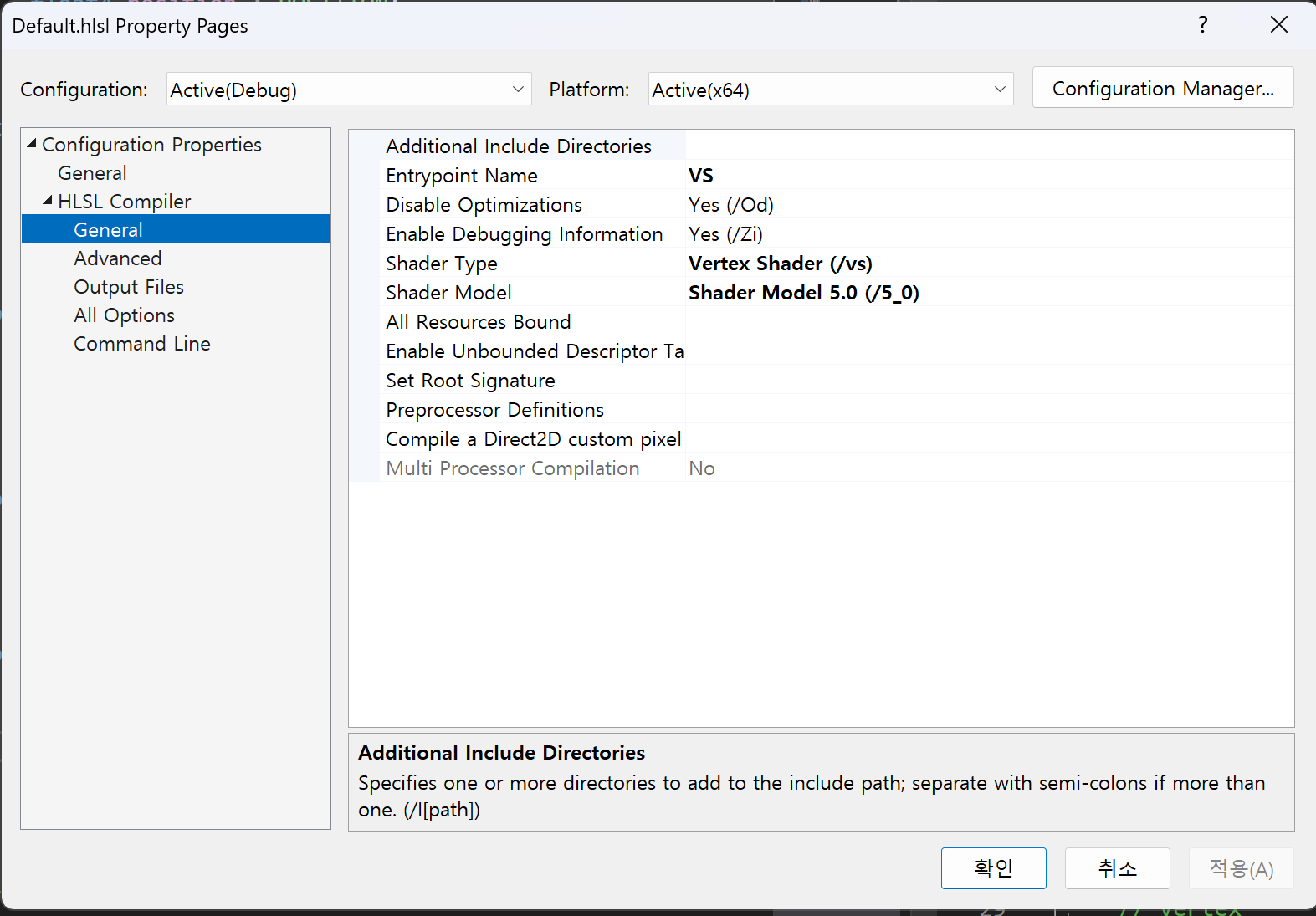 VS라는 Vertex Shader 진입접은 .hlsl파일의 속성 -> HLSL Compiler -> General에서 아래와 같이 설정하였습니다.