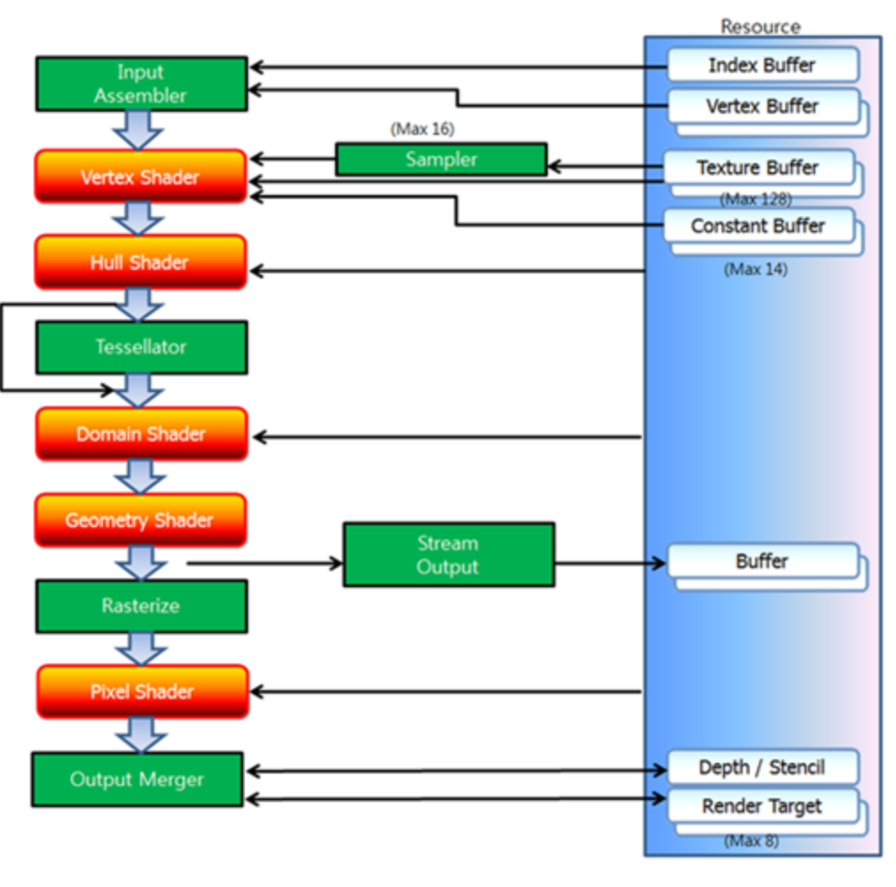 빨간색 부분은 Programmable 단계로 HLSL로 shader 프로그래밍이 가능한 단계.