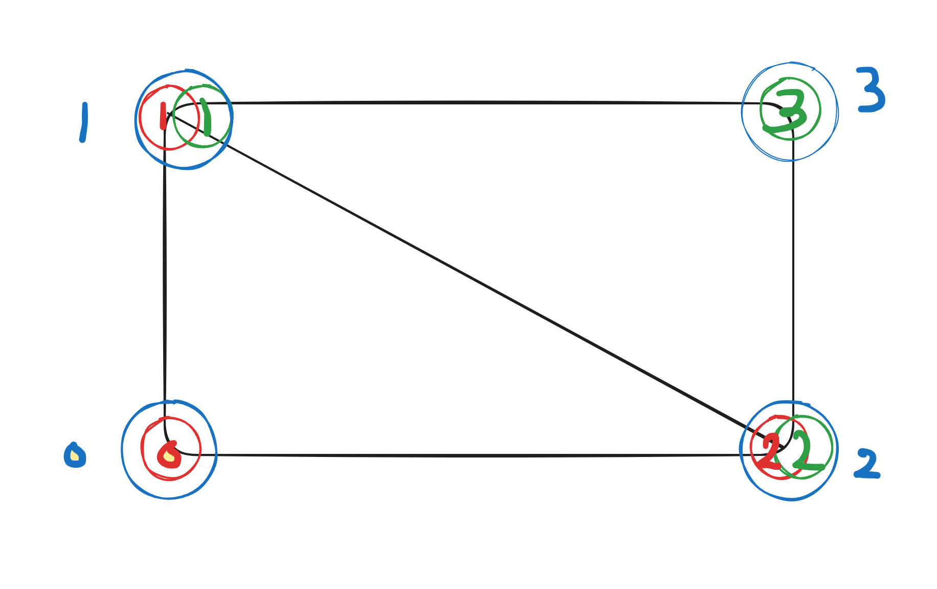 빨간색 원부터 0 -> 1 -> 2 읽고 다시 초록색 2-> 1 -> 3 읽어들여서 삼각형 + 삼각형 그려서 사각형을 만드는 것보다