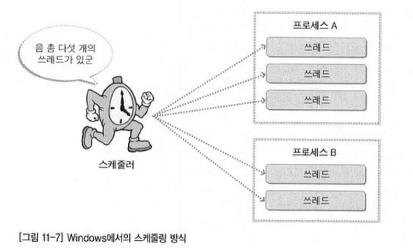 윈도우에서는 스케쥴러가 스레드를 스케줄링을 하는데 이때 컨텍스트 스위칭이 발생한다.