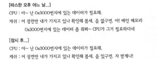 CPU에서 한 번 이상 읽어들인 메인 메모리의 데이터를 저장하고 있다가 CPU가 다시 그 메모리에 저장된 데이터를 요구할 때, 메인 메모리를 통하지 않고 바로 값을 전달해주는 용도의 메모리이다.