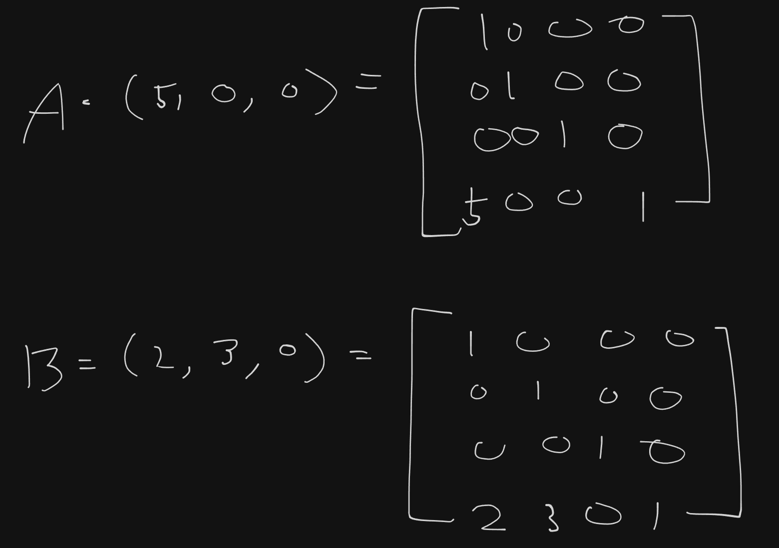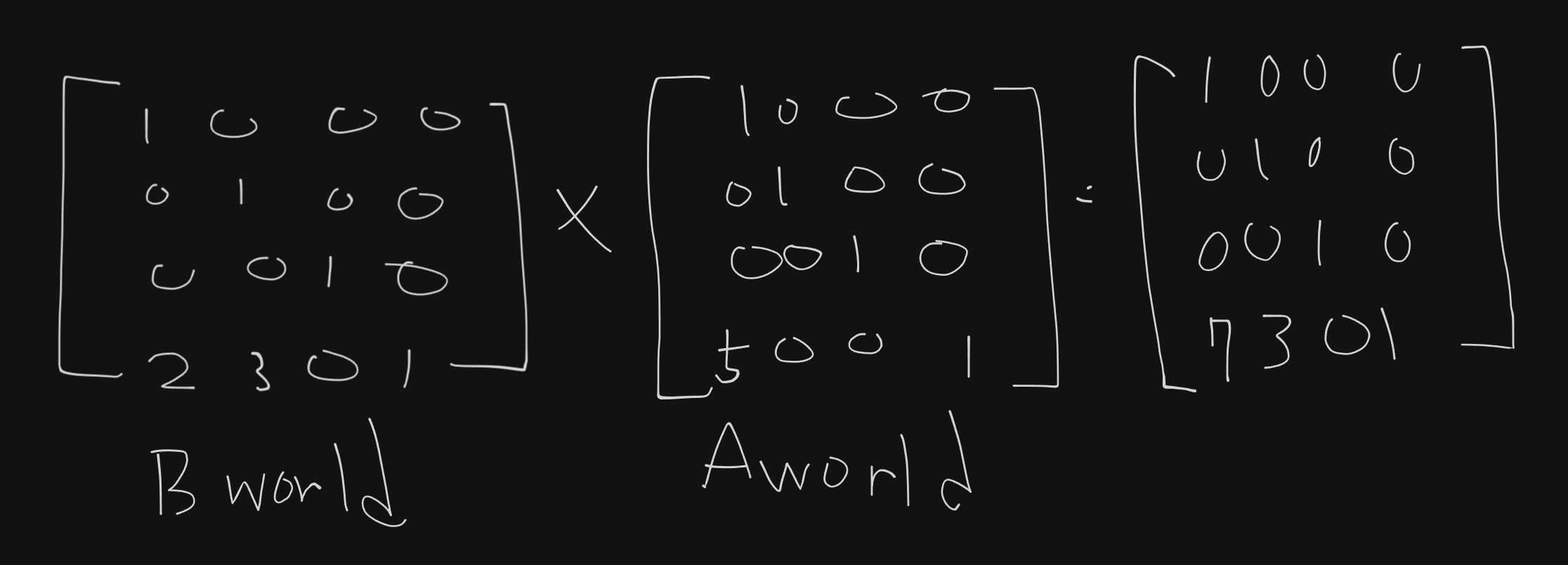 이것을 풀어서 설명하면 B는 A로 부터 상대적인 위치는 (2, 3, 0)만큼 떨어져 있고 B의 월드 위치는 부모인 A의 월드 행렬을 곱하면 (7, 3, 0)으로 구할 수 있다는 뜻이 된다.