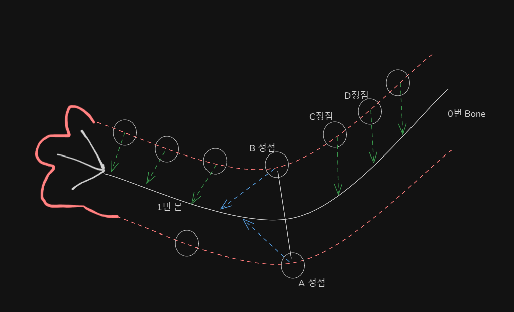 팔을 몸 안쪽으로 굽히는 애니매이션을 동작 시킬 때 1번 본이 움직이면서 아래처럼 A정점의 위치가 변경될 것이다.