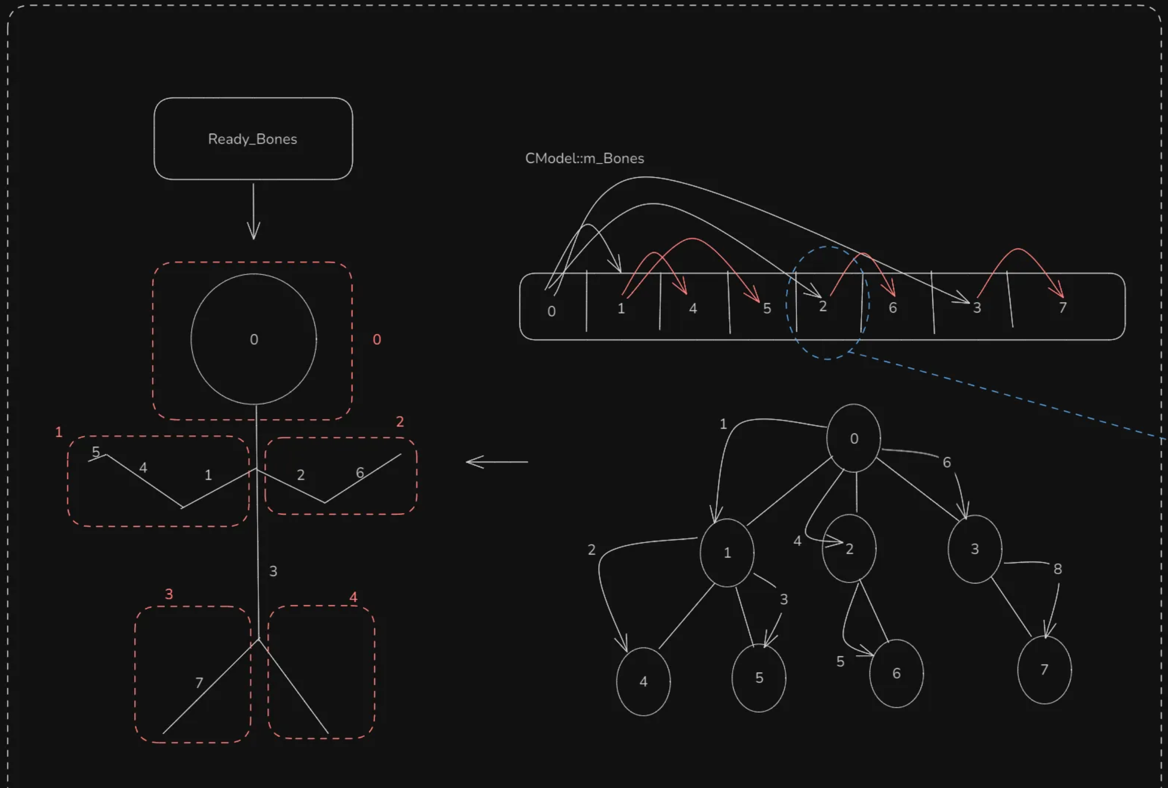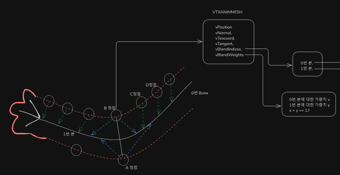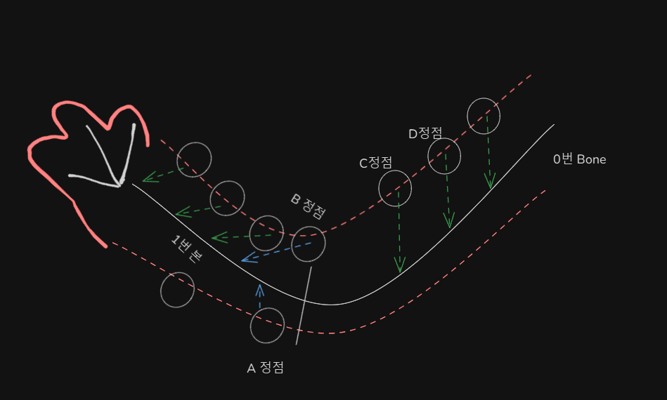 따라서 각 정점은 A, B, C, D모두 자신이 따라가야할 뼈의 정보를 가져야 한다. (여기서는 뼈 정보를 인덱스라 표현하겠다)