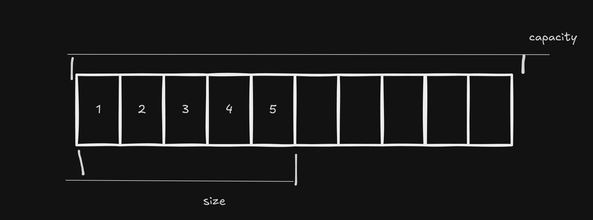 size는 배열에 들어있는 원소의 개수를 말하고 capacity는 할당받은 전체 사이즈를 말한다.